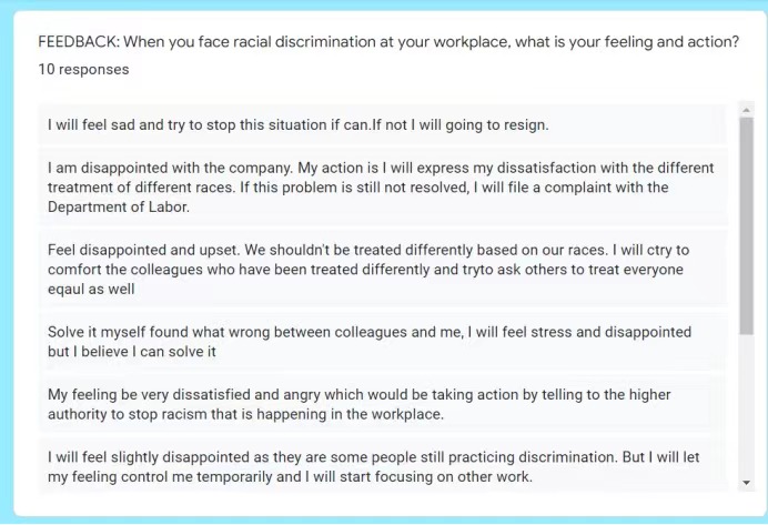 Below is the feedback of “When you face racial discrimination at your workplace, what is your feeling and action”?