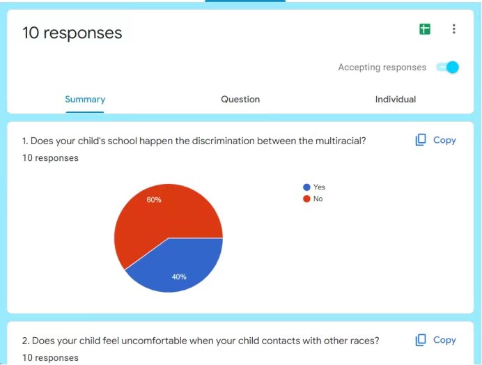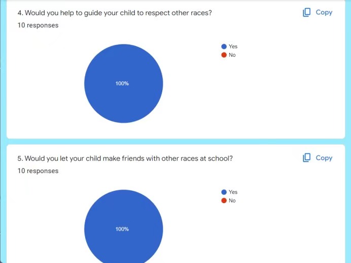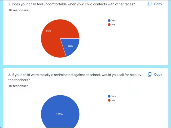 According to my collected data, the activity had been participated by 10 respondents. The result from the first question is 6 out of 10 parents state that their child’s school had happened the discrimination between the multiracial. The second question is 8 out of 10 parents mention that their child haven’t feel uncomfortable when contact with other races. Thirdly, 10 out of 10 parents had stated that they will call for help by the teachers if their children were racially discriminated against at school. Fourthly, 10 out of 10 parents had mentioned that they will guide their children to respect other races. Fifthly, 10 out of 10 parents also let their children to make friends with other races at school. In the question of number 6, 10 out of 10 parents had stated that different races can study in the same school. In the question of number 7, 9 out of 10 parents had mentioned that their child’s school has celebrate festivals of different races. In the question of number 8, 6 out of 10 parents had stated that their workplace had happened racial discrimination in their previous experience. In the question of number 9, 9 out of 10 parents will try to stop when their colleagues are discriminated against other races. In the last question, 5 out of 5 parents stated that their boss treats different races fairly while another 5 parents stated that their boss will not treat fairly among different races in the workplace.